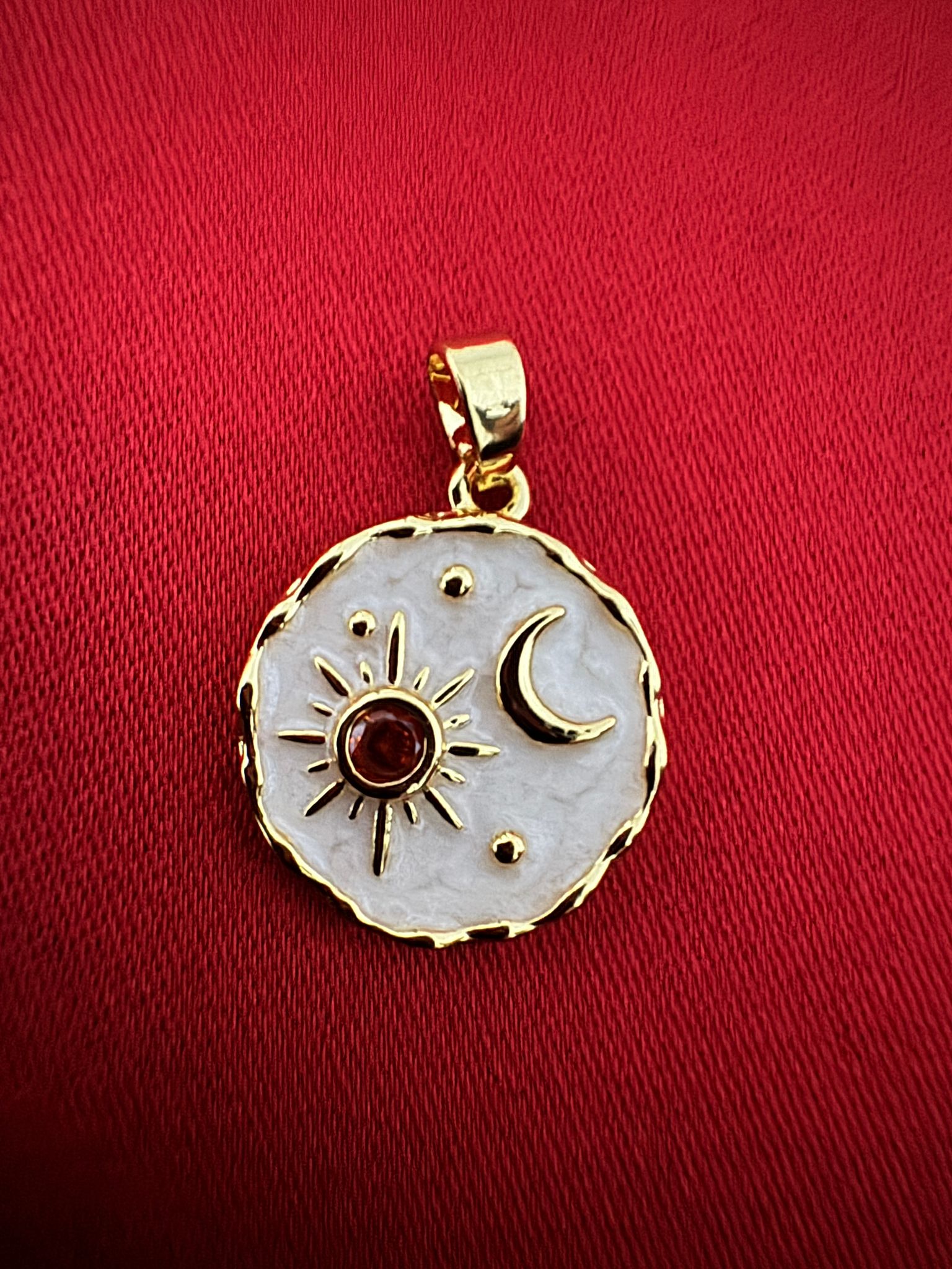 Ortadaki kırmızı taş güneşin sıcaklığını, ay detayı ise gecenin büyüsünü simgeler. Bu eşsiz tasarım, sadece bir aksesuar değil; tarzınızı, ruhunuzu ve enerjinizi yansıtan bir imza parçasıdır.