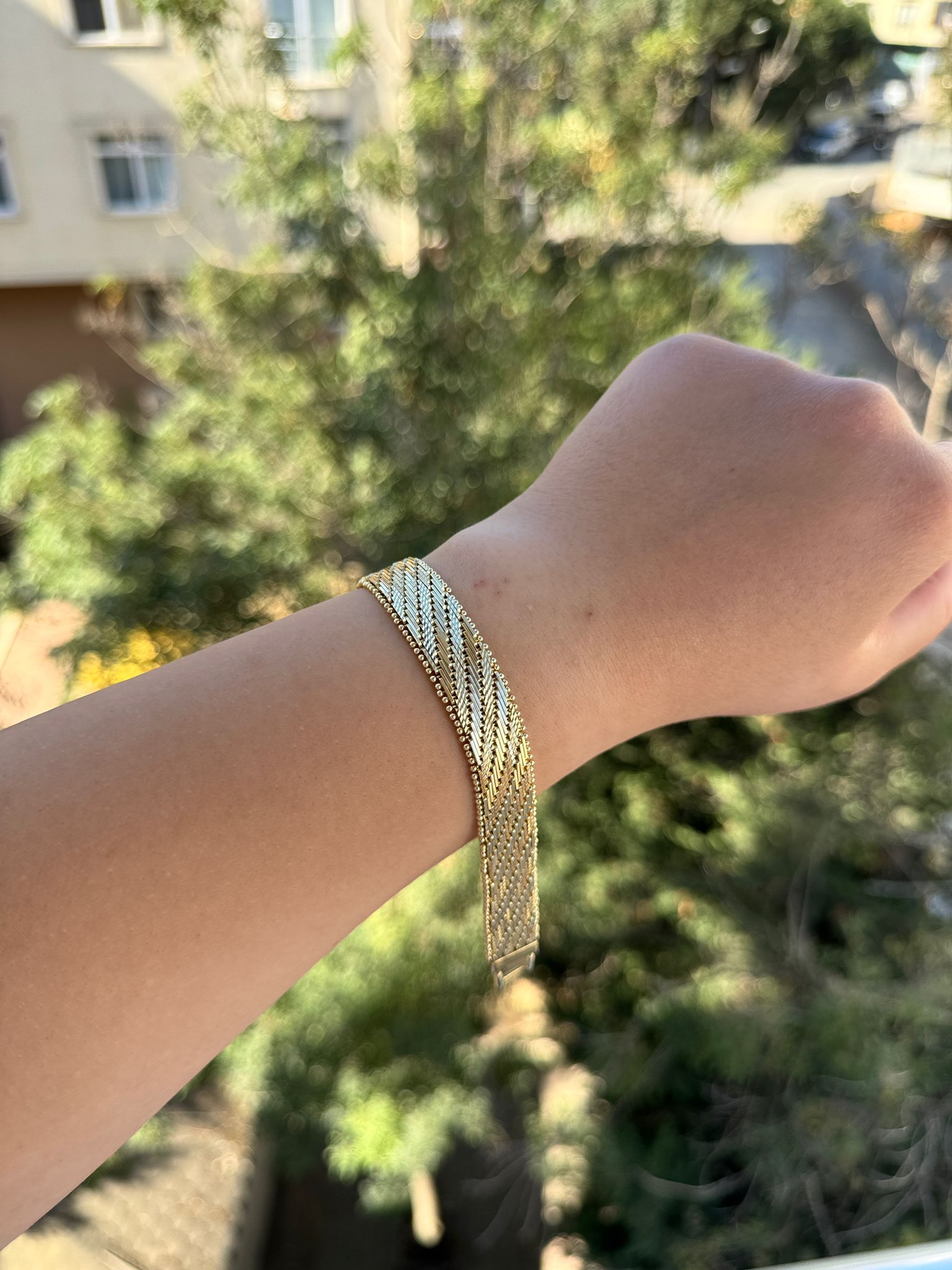 14K Altın Kaplama Hasır Desenli Geniş Kadın Bileklik Modeli