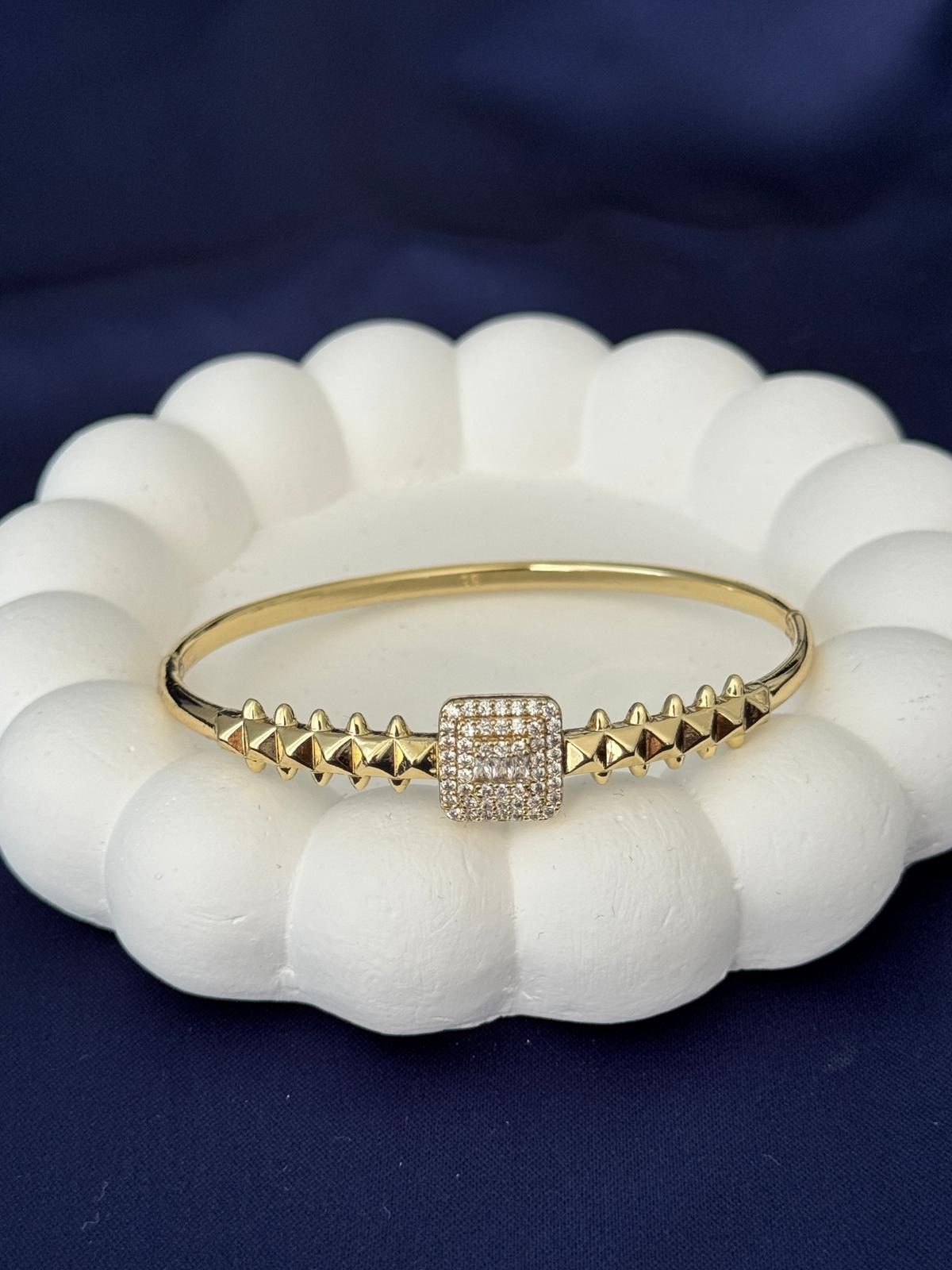 Modern tasarımı ve göz alıcı taş detaylarıyla bu bilezik, zarafetinize ışıltı katıyor. Kare formdaki taşlı merkezi ve yanlardaki özel tasarım detaylarıyla bileğinizde fark yaratın. Hem günlük kullanımda hem de özel davetlerde şıklığınızı tamamlayacak.