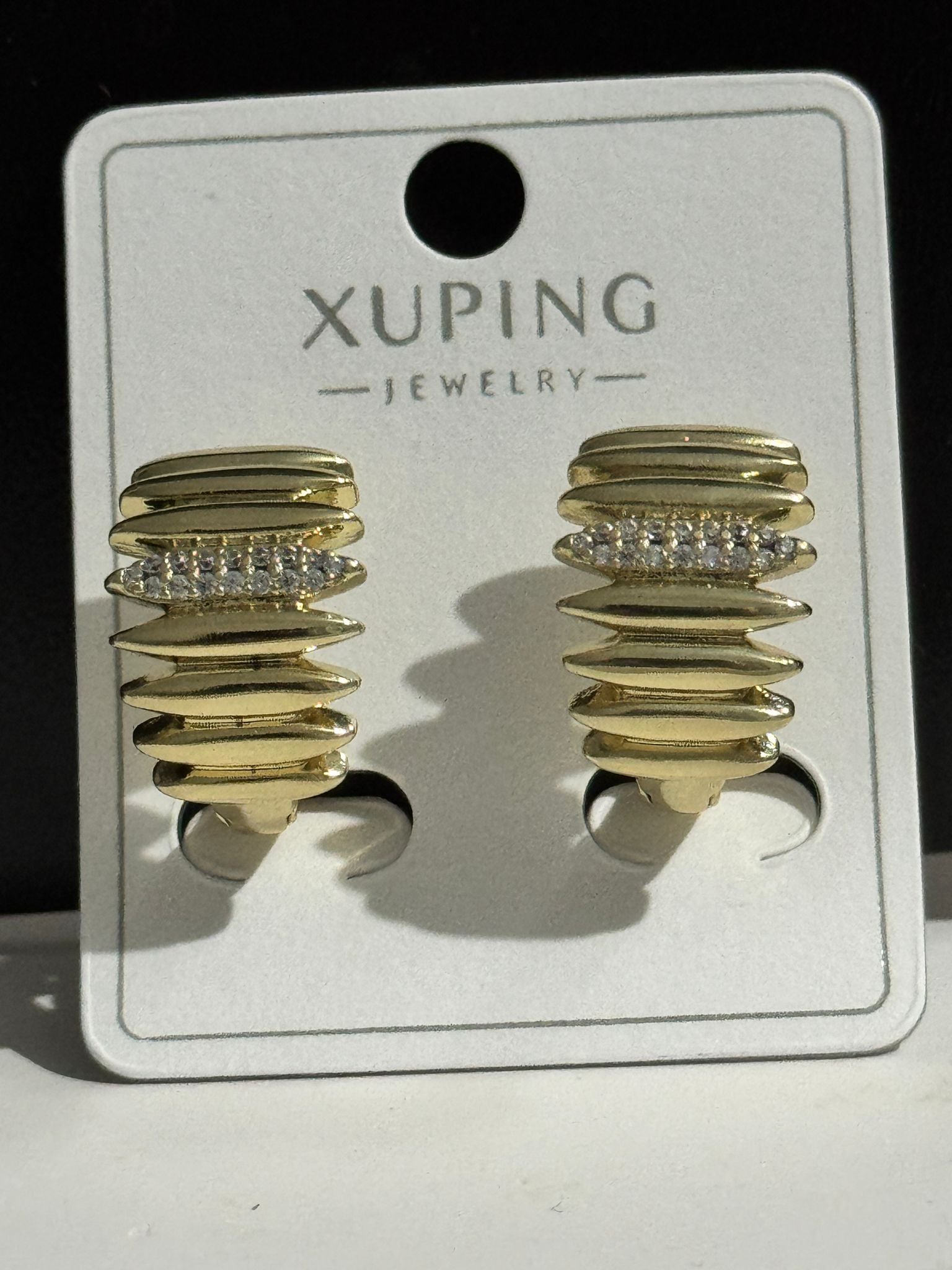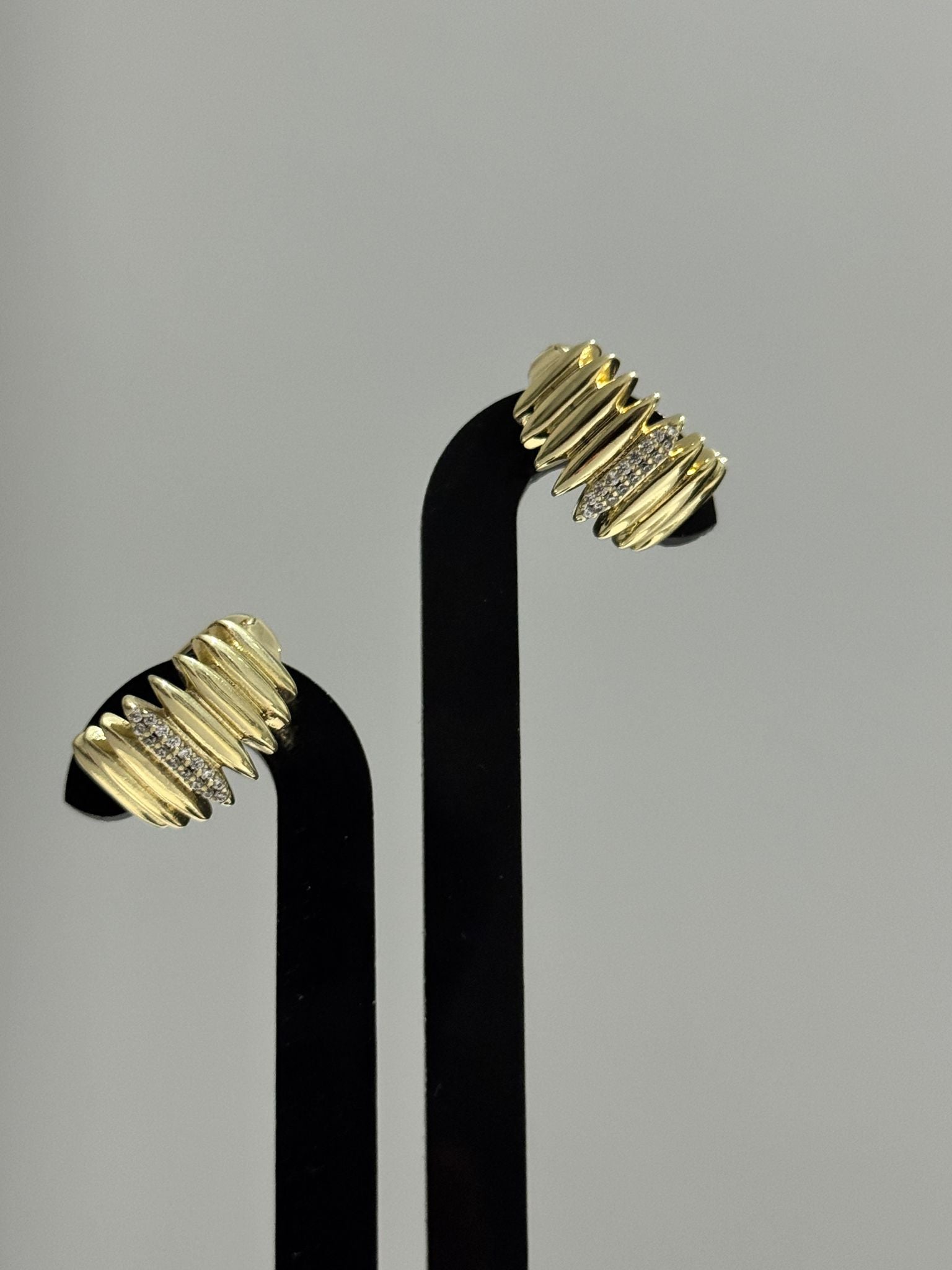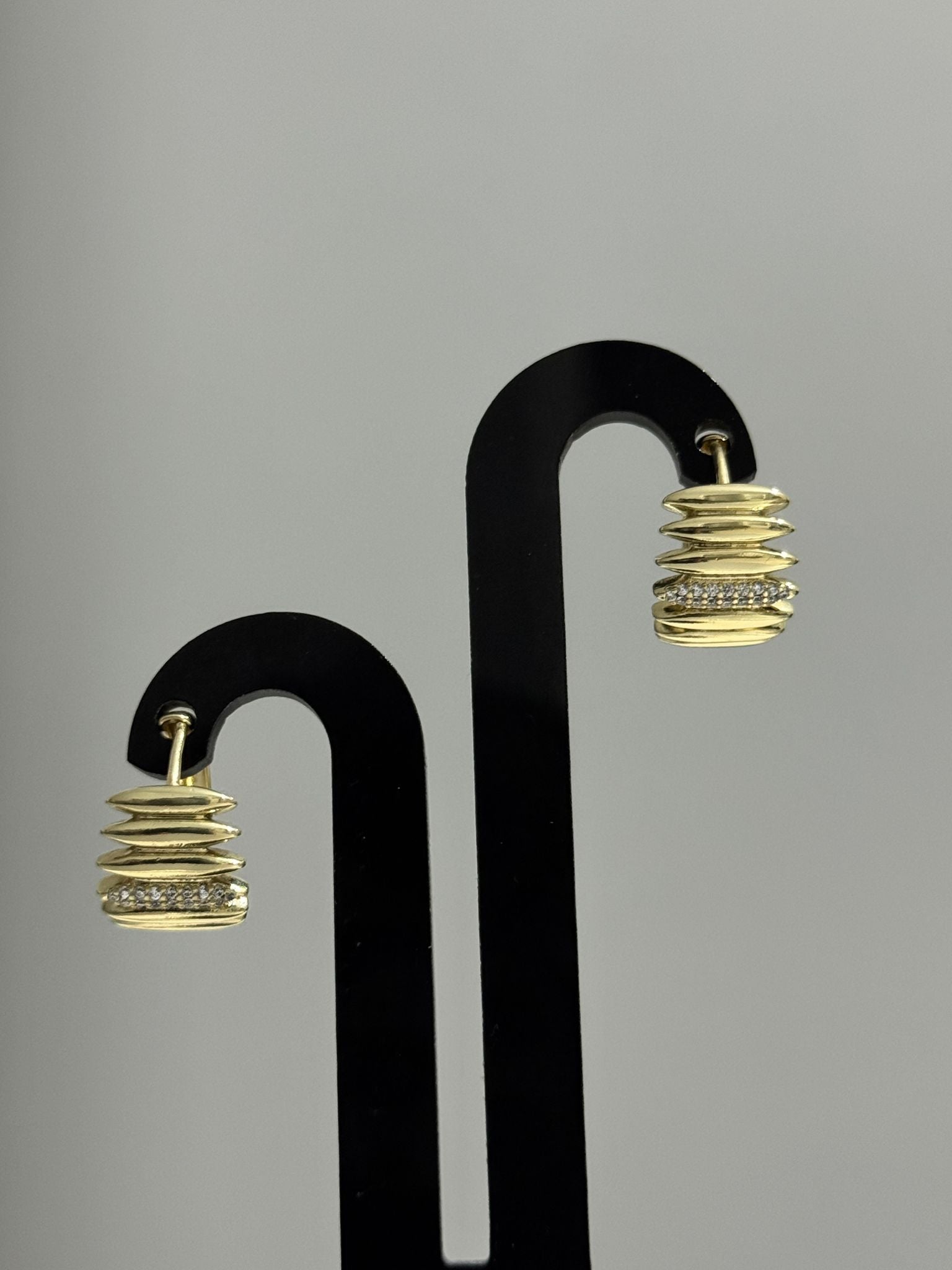 Katmanlı altın formu ve ortasında yer alan ışıltılı taş dizaynıyla hem modern hem de klasik tarzı bir araya getiriyor. Parlak yüzeyiyle ışığı mükemmel şekilde yansıtan bu küpe, stilinize güçlü bir zarafet katıyor.