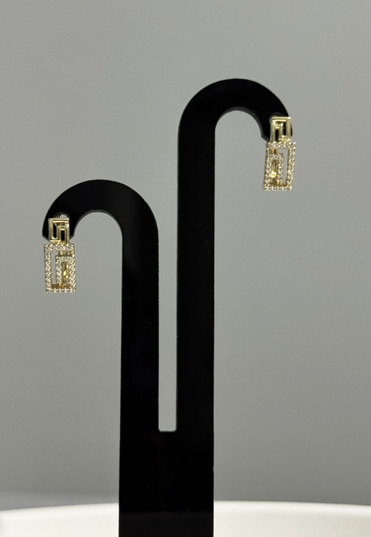 Modern çizgilerle tasarlanmış dikdörtgen formu ve zarif taş işlemeleriyle dikkat çeken bu küpe, şıklığınıza sofistike bir dokunuş katıyor. Işıltılı detaylarıyla hem gündüz hem de gece kombinlerinde öne çıkan zarif bir aksesuar.