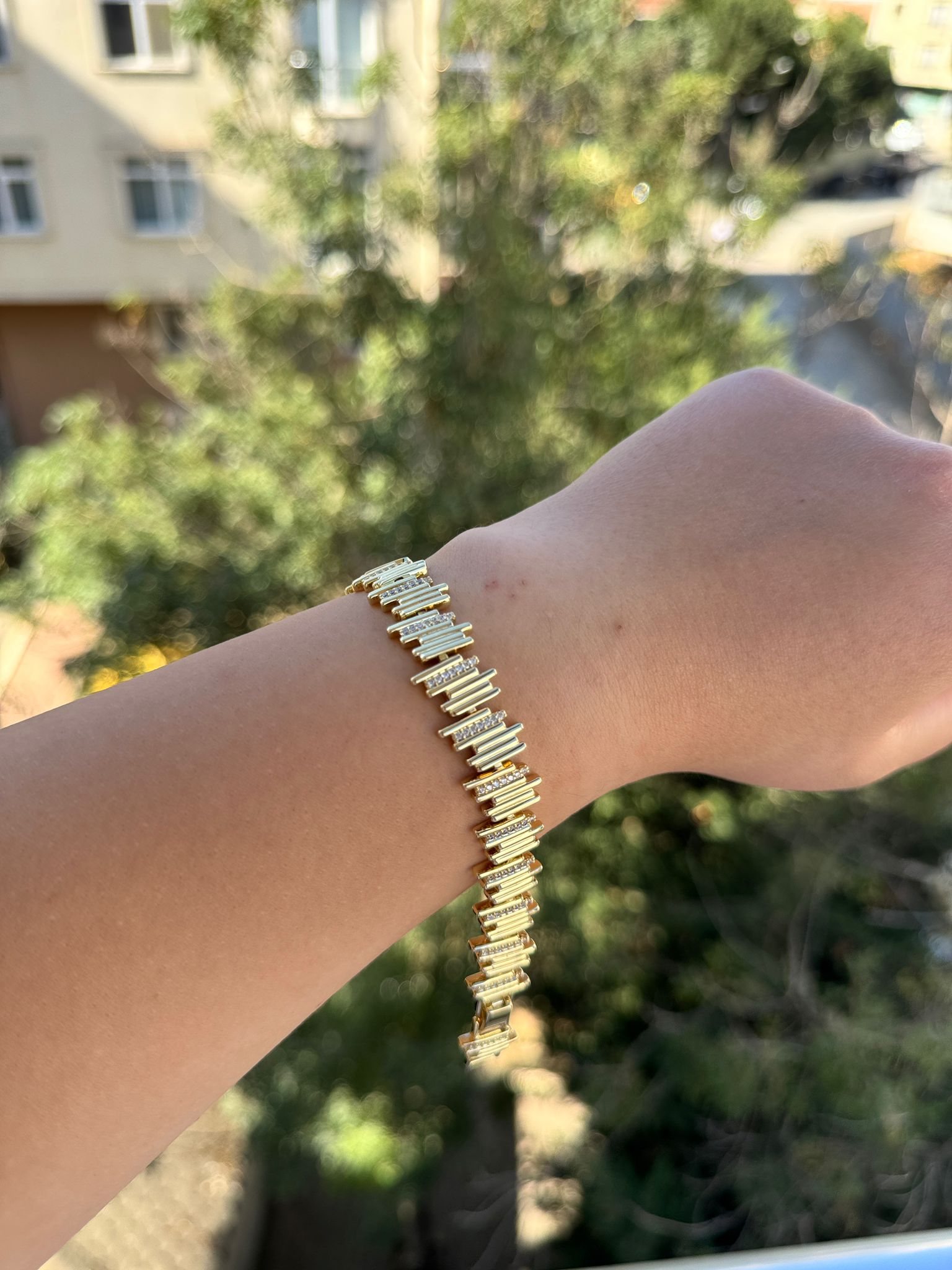 Yan yana sıralanmış dikdörtgen formlu parçaları ve zirkon taş detayları, bilekliğe göz alıcı bir şıklık katar.