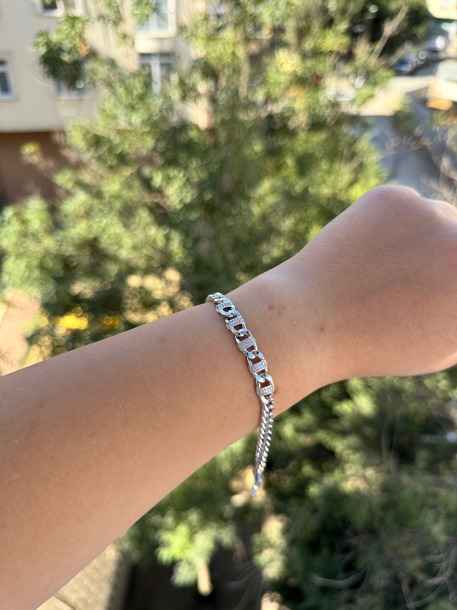 Modern tasarımıyla dikkat çeken bu gümüş kaplama bileklik, zincir halkaları ve zirkon taş detaylarıyla şıklığınızı ön plana çıkarır.