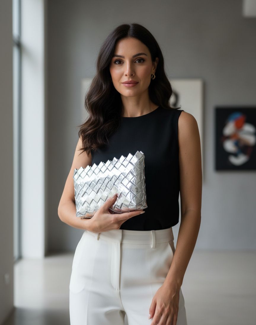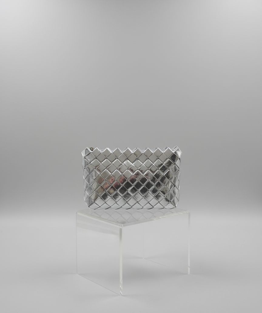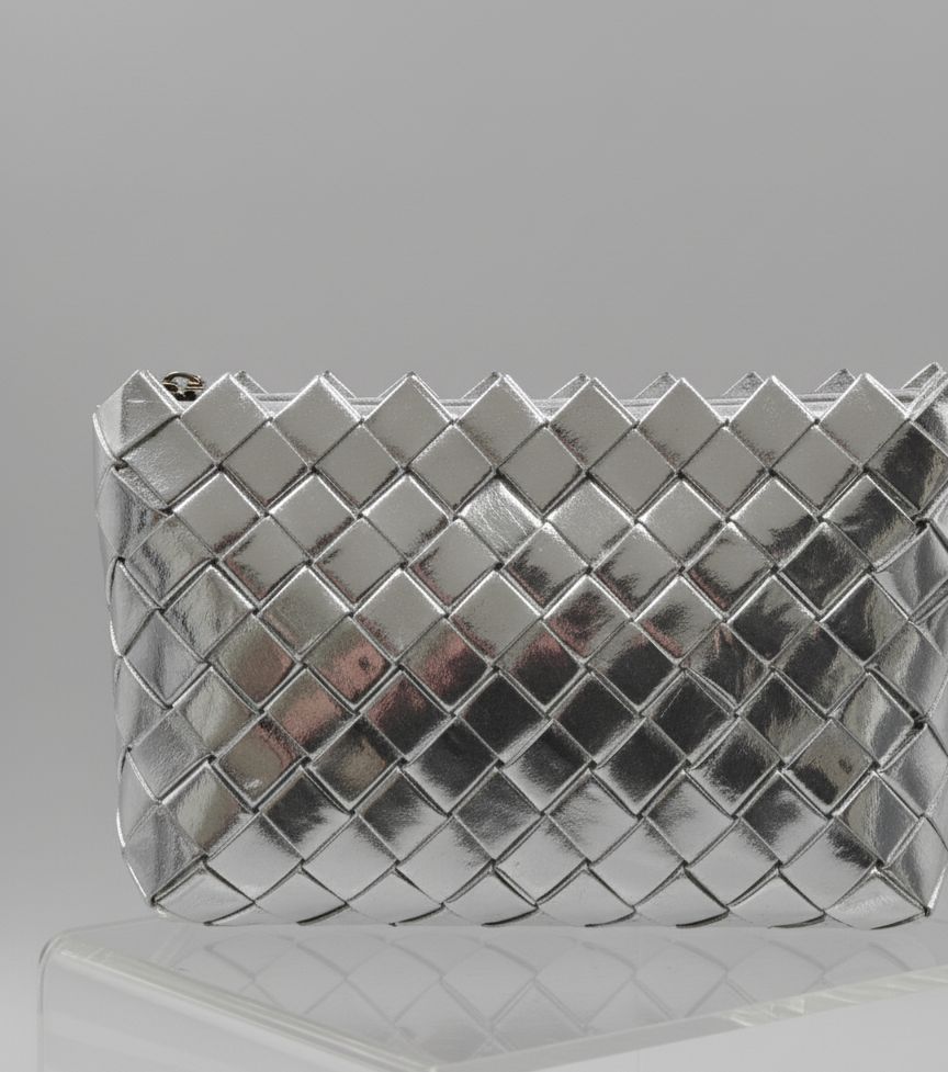 Göz kamaştırıcı metalik gümüş dokusu ve modern geometrik tasarımıyla bu clutch çanta, stilinizi bir üst seviyeye taşıyor. Zarif örgü deseni sayesinde hem klasik hem de avangart bir hava sunan bu özel parça, her kombininize sofistike bir dokunuş katacak.